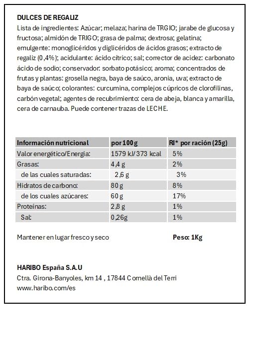 Lista de ingredientes: Azúcar; melaza; harina de TRGIO; jarabe de glucosa y fructosa; almidón de TRIGO; grasa de palma; dextrosa; gelatina; emulgente: monoglicéridos y diglicéridos de ácidos grasos; extracto de regaliz (0,4%); acidulante: ácido cítrico; sal; corrector de acidez: carbonato ácido de sodio; conservador: sorbato potásico; aroma; concentrados de frutas y plantas: grosella negra, baya de saúco, aronia, uva; extracto de baya de saúco; colorantes: curcumina, complejos cúpricos de clorofilinas, carbón vegetal; agentes de recubrimiento: cera de abeja, blanca y amarilla, cera de carnauba. Puede contener trazas de LECHE.