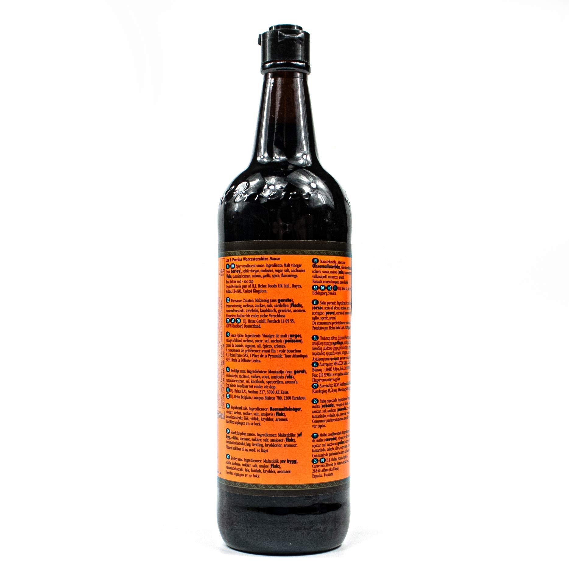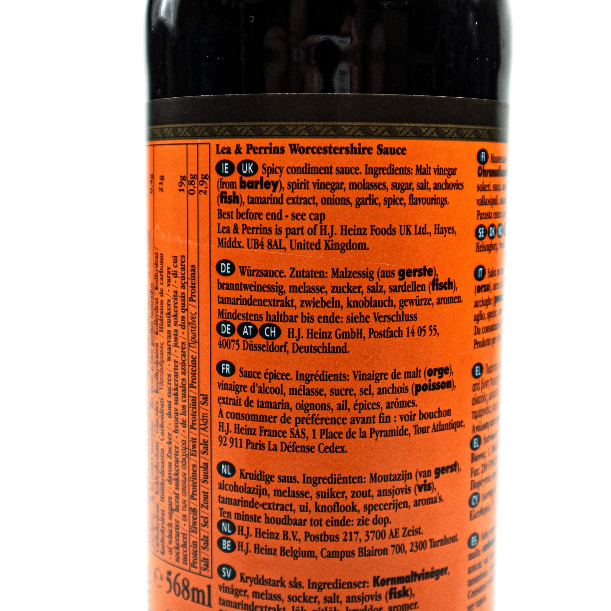 Vinagre de malta (cebada), vinagre de aguardiente, melaza, azúcar, sal, anchoas (pescado), extracto de tamarindo, cebolla, ajo, especias, sabores