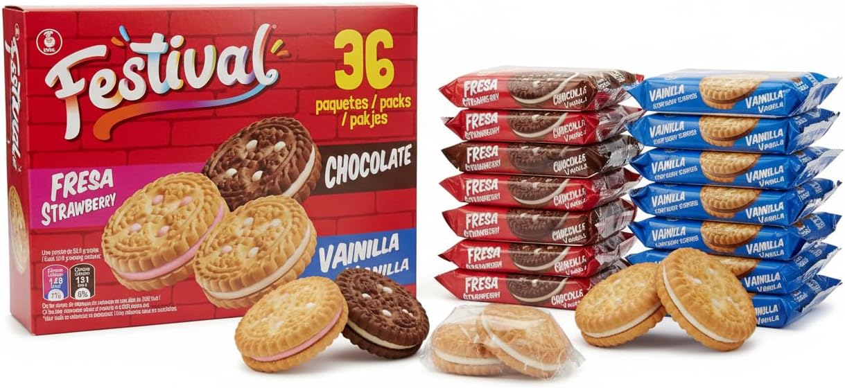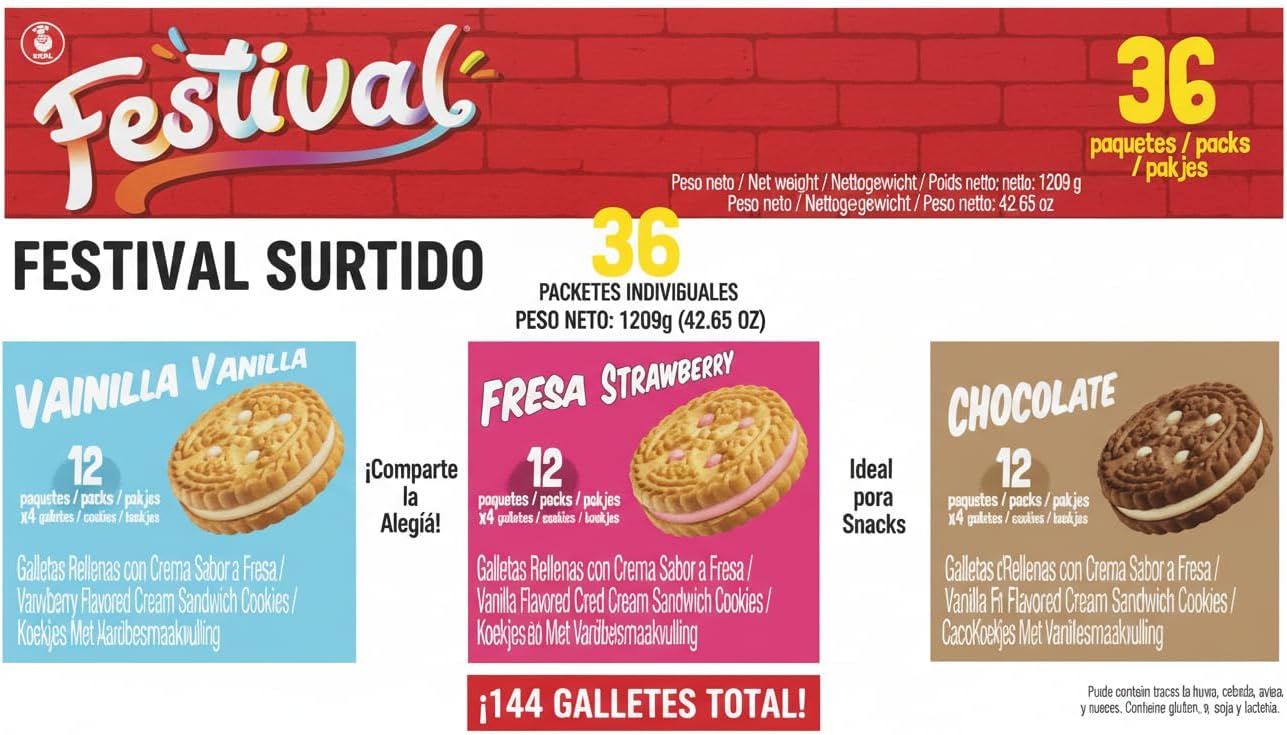 - 🍪 Surtido Irresistible de 3 Sabores: Disfruta de la combinación perfecta con 12 paquetes de vainilla, 12 de fresa y 12 de chocolate, todos con un relleno cremoso y delicioso.