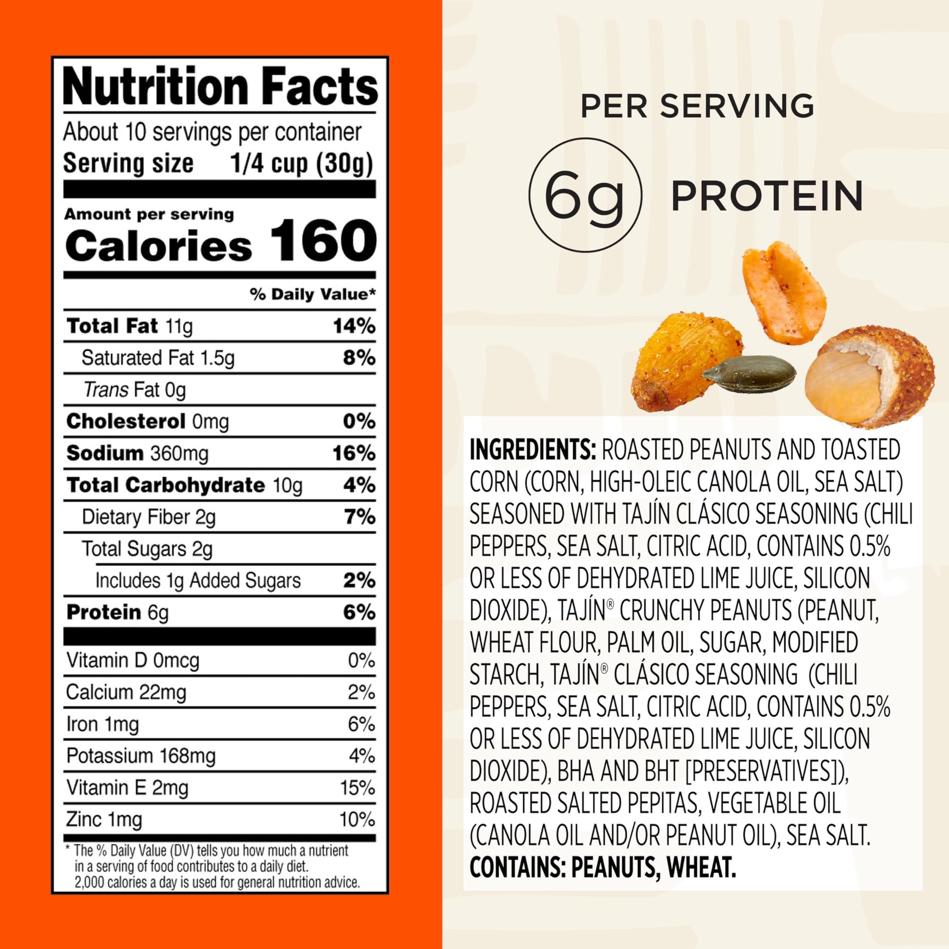 - Mezcla audaz y crujiente: este aperitivo incluye cacahuetes, cacahuetes crujientes, maíz tostado y pepitas sazonadas con condimento Tajin Clasico, una mezcla de chiles, sal marina y lima. Suave en calor pero audaz en sabor, la mezcla seguramente satisfará.