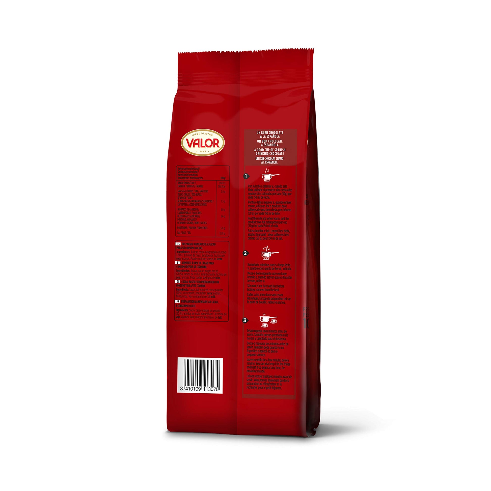 Valorcao Chocolate a la taza. El Chocolate a la Taza de Valor no contiene Gluten. Se presenta en cacao en polvo y te permite disfrutar del chocolate a la taza de una manera rápida y sencilla sin renunciar al auténtico sabor del Chocolate. Preparado alimenticio para su consumo cocido. Preparalo para disfrutar de un intenso sabor y aroma. Selección exclusiva de cacao premium. El chocolate Valor es creado por maestros Chocolateros con algunos de los Mejores Cacaos del Mundo. Su gran calidad consigue deleitar a los paladares más exigentes.